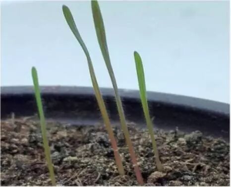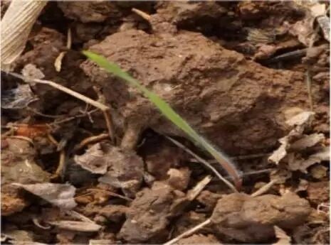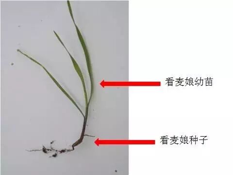 看麦娘和日本看麦娘幼苗期非常相近,主茎和分枝簇生,向四周匍匐生长,并在节间处生有不定根;基本茎杆和叶鞘呈紫褐色;真叶线性,仅有3条直出叶脉,第一真叶顶端圆钝,第二和第三真叶顶端尖锐;叶舌膜质透明呈剑形,没有凹痕。